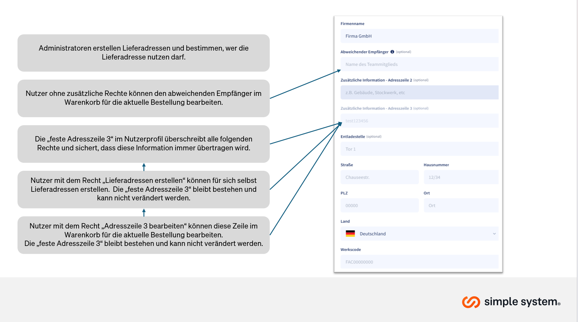 Ab dem 19. Februar 2026 ca. 18:00 Uhr, führt simple system eine neue Logik zur Verwaltung von Lieferadressen ein. Administratoren erhalten dadurch deutlich mehr Kontrolle über kritische Adressfelder. Gleichzeitig müssen bestehende Lieferadressen vor dem Stichtag geprüft und ggf. angepasst werden.