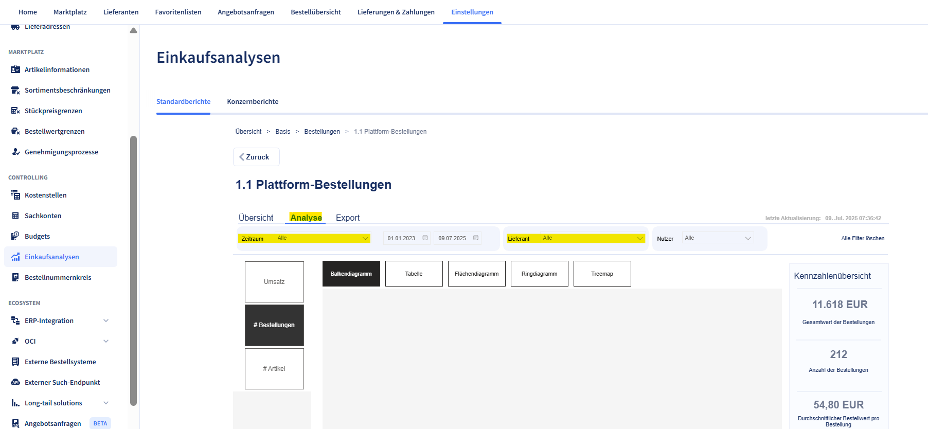 Wählen Sie hier die "Plattform-Bestellungen" aus, geben Sie nun mit den Filtern den gewünschten Zeitraum und Lieferanten an. Unter Analysen können Sie sich die gewünschte Ausgabe Art auswählen.
