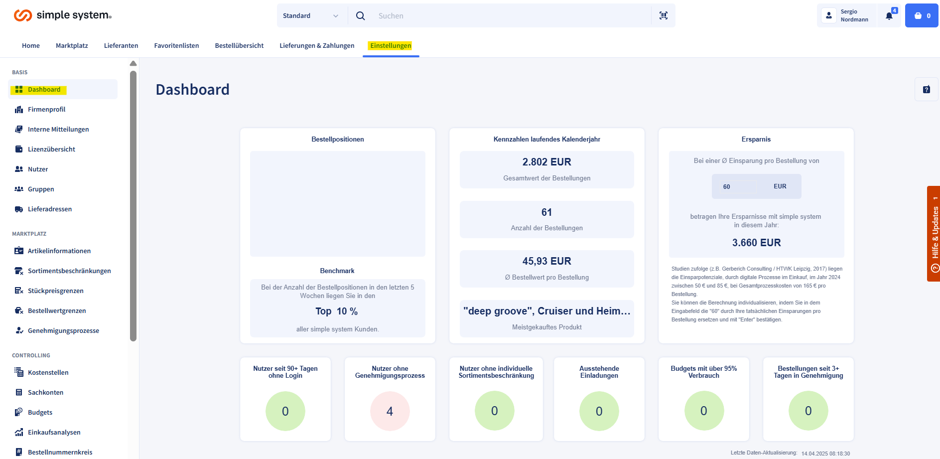 Im Dashboard werden ausgewählte Informationen über Ihren Kundenaccount angezeigt. Hier sehen Sie auf einen Blick mögliche Probleme oder fehlerhafte Konfigurationen. Sie sehen, wie viel wird das System genutzt wird, was es einspart und wie Sie es optimieren können. Durch einen Klick auf das gewünschte Element können Sie direkt in die Detail-Einkaufsanalysen springen.