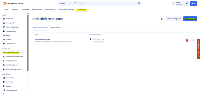 Um Kundenartikelnummern oder ein Kernsortiment auf simple system hochzuladen, gehen Sie auf hinzufügen und wählen Sie zwischen Kundenartikelnummernliste oder Kernsortiment. Sie können nur eine Kundenartikelnummerliste hochladen, haben aber die Möglichkeit diese bei Bedarf zu aktualisieren. Ein Kernsortiment wird immer pro Lieferant hochgeladen.