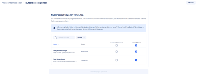 In den Artikelinformationen können Sie über die Nutzerberechtigungen auch Rechte zur Bearbeitung von Kundenartikelnummern und externen Referenzen auf Artikelbasis vergeben.