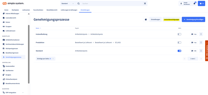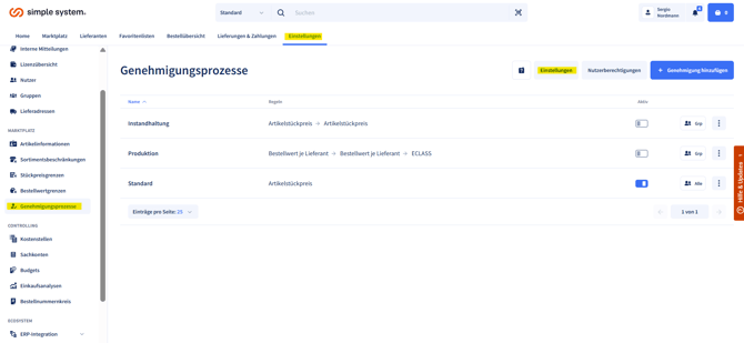 Mit Genehmigungsprozessen können Sie Bestellungen Ihrer Nutzer genehmigen lassen, bevor sie an den Lieferanten weitergeleitet werden. Sie können verschiedene Kriterien (Regeln) definieren, die eine Bestellanfrage in den Genehmigungsprozess eintreten lassen. Wenn eine Bestellanfrage die Regeln erfüllt, wird diese bis zur Genehmigung zurückgehalten. Hierbei können auch mehrere Instanzen bzw. Regeln in einem Prozess hintereinander geschaltet werden.