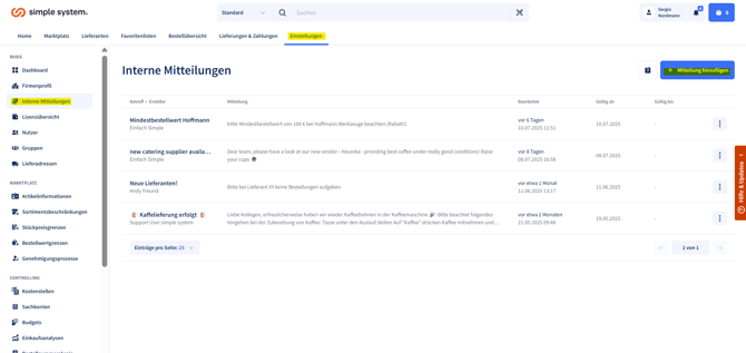 Mit internen Mitteilungen können Sie wichtige Informationen rund um den Einkauf klar und effizient innerhalb Ihrer Organisation kommunizieren. Legen Sie fest, in welchem Zeitraum eine Mitteilung angezeigt werden soll. Sobald eine neue Mitteilung aktiv wird, wird sie den Nutzern automatisch angezeigt. Die Mitteilungen werden im Mitteilungs-Center absteigend nach dem letzten Bearbeitungsdatum sortiert (analog zur Sortierung in der Admin-Ansicht). Die aktuellsten Änderungen erscheinen zuerst.