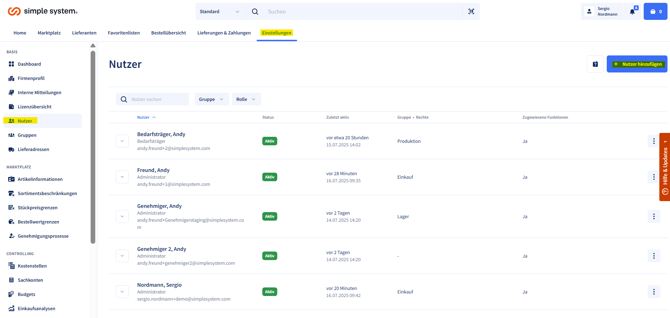 Hier sehen Sie alle Nutzer in Ihrem Account. Laden Sie neue Nutzer ein oder ändern Sie die Rechte am gewünschten Nutzer. Sehen Sie unter "Details ansehen" alle Einstellungen am Nutzer und springen Sie direkt in die Bereiche ab.
